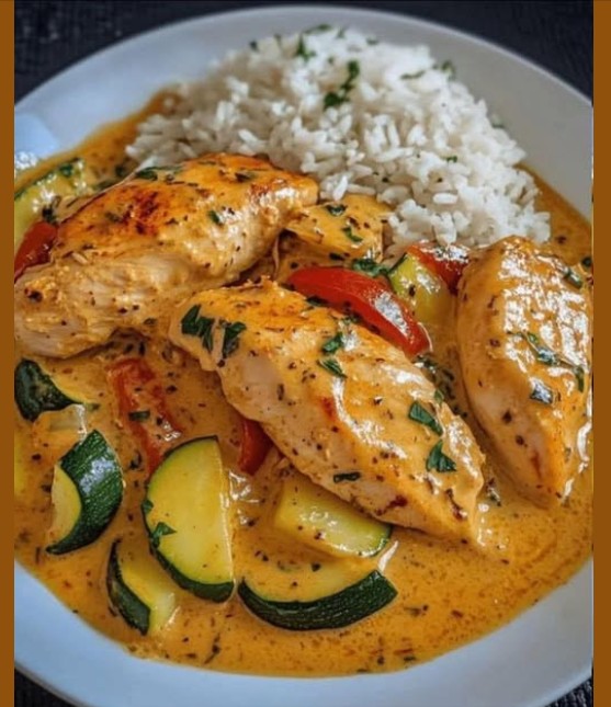 Creamy Tuscan-style chicken is a comforting, elegant dish that brings together tender pan-seared chicken breasts, a rich garlic cream sauce, and fresh vegetables such as zucchini and red bell peppers. The sauce is gently seasoned with herbs and spices, creating a balanced flavor that is neither too heavy nor too mild. Served alongside fluffy white rice, this meal is perfect for family dinners, meal prep, or even entertaining guests.