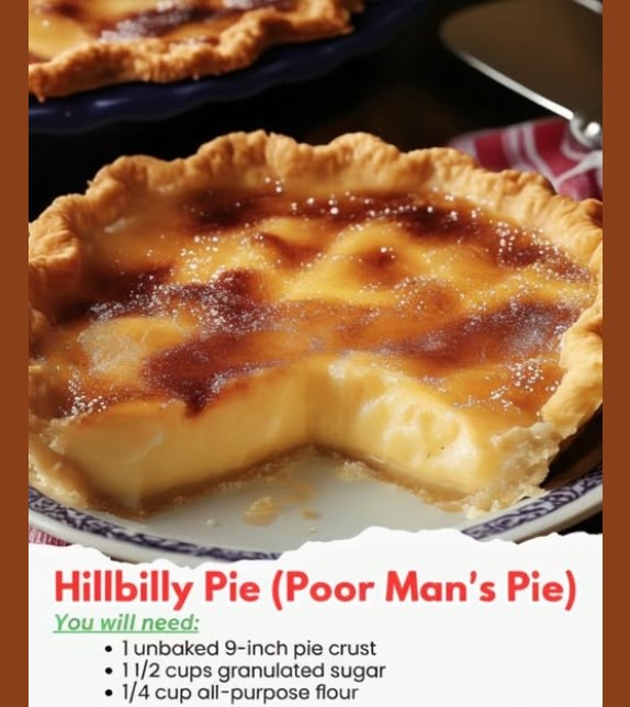 Hillbilly Pie, also known as Poor Man’s Pie, is a simple, custard-style dessert that comes from times when ingredients were few but creativity was rich. It’s creamy, lightly caramelized on top, and incredibly comforting. Think of it as a cross between a sugar custard and a chess pie, made with pantry staples and baked in a flaky crust.