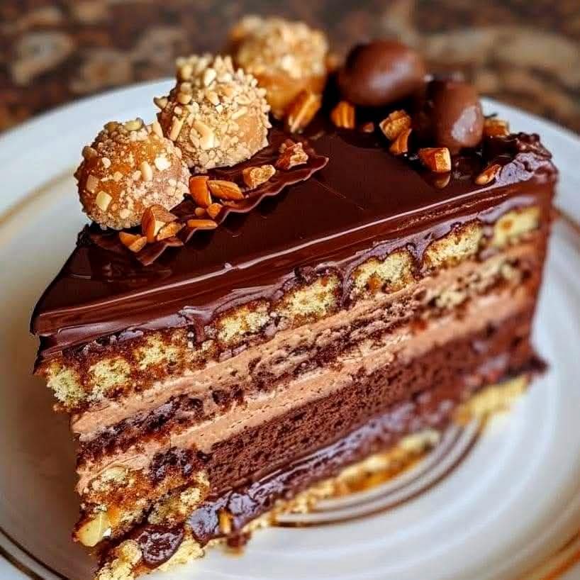 Full Recipe DescriptionThis Ferrero Rocher Cake is a luxurious chocolate dessert inspired by the iconic Ferrero Rocher chocolates. It features moist cocoa cake layers, a rich chocolate cream filling, crunchy hazelnuts, pieces of Ferrero Rocher, and a silky dark chocolate ganache. The result is an indulgent, elegant cake with balanced sweetness, deep chocolate flavor, and irresistible texture.IntroductionChocolate lovers will instantly fall in love with this Ferrero Rocher Cake. Combining the richness of cocoa, the creaminess of chocolate custard, and the nutty crunch of hazelnuts, this cake is perfect for celebrations, birthdays, or special family gatherings. It delivers bakery-style elegance while being achievable at home with simple ingredients.Origin and Cultural SignificanceFerrero Rocher chocolates originate from Italy and are globally associated with luxury, gifting, and celebrations. Cakes inspired by Ferrero Rocher have become popular worldwide, especially in European and Middle Eastern dessert culture, symbolizing indulgence, generosity, and festive joy. This cake adapts that iconic flavor into a homemade masterpiece.Ingredients QuantityFor the Cake4 eggs1 cup granulated sugar1 cup milk½ cup vegetable oil2 tablespoons cocoa powder1 packet vanilla extract1 packet baking powder2 cups all-purpose flourFor the Cream1 liter milk1 cup granulated sugar3 tablespoons flour2 tablespoons cornstarch2 tablespoons cocoa powder1 packet vanilla1 tablespoon butter1 packet liquid cream (200 ml)For the Middle Layer & Topping1 cup coarsely chopped hazelnuts6–8 Ferrero Rocher chocolates, choppedFor the Ganache200 ml liquid cream160 g dark chocolateOptional AdditionsChocolate syrup brushed onto cake layers for extra moistureA thin layer of Nutella between layersRoasted hazelnut praline for garnishGold dust or edible gold leaf for a luxury finishTips for SuccessSift dry ingredients to ensure a light, fluffy cake textureLet the custard cream cool completely before adding whipped creamToast hazelnuts lightly to enhance their flavorChill the cake well before slicing for clean, professional-looking layersUse good-quality dark chocolate for a smooth, glossy ganacheInstructions1️⃣ CakeBeat eggs and sugar until light and fluffy. Add milk and oil and mix well. Add cocoa powder, vanilla, and baking powder. Gradually sift in the flour and mix until smooth.Pour into a greased 26 cm pan and bake at 170°C (340°F) for 35–40 minutes. Allow to cool completely, then slice into 2 or 3 layers.2️⃣ CreamIn a saucepan, combine milk, sugar, flour, cornstarch, and cocoa. Cook over medium heat, stirring constantly, until thick. Remove from heat and add vanilla and butter.Once fully cooled, add the liquid cream and beat until smooth and fluffy.3️⃣ GanacheHeat the cream until hot but not boiling. Remove from heat, add chopped dark chocolate, and stir until fully melted and glossy.4️⃣ Assembling the CakeSpread cream over the first cake layerSprinkle with chopped hazelnuts and Ferrero Rocher piecesRepeat for remaining layersCover the top and sides with chocolate ganache5️⃣ DecorationDecorate with Ferrero Rocher chocolates, chopped hazelnuts, or grated chocolate.Nutritional Information (Approximate per slice)Calories: 420–460 kcalCarbohydrates: 45 gFats: 25 gProtein: 7 gSugar: 30 g(Values may vary depending on portion size and ingredients used.)