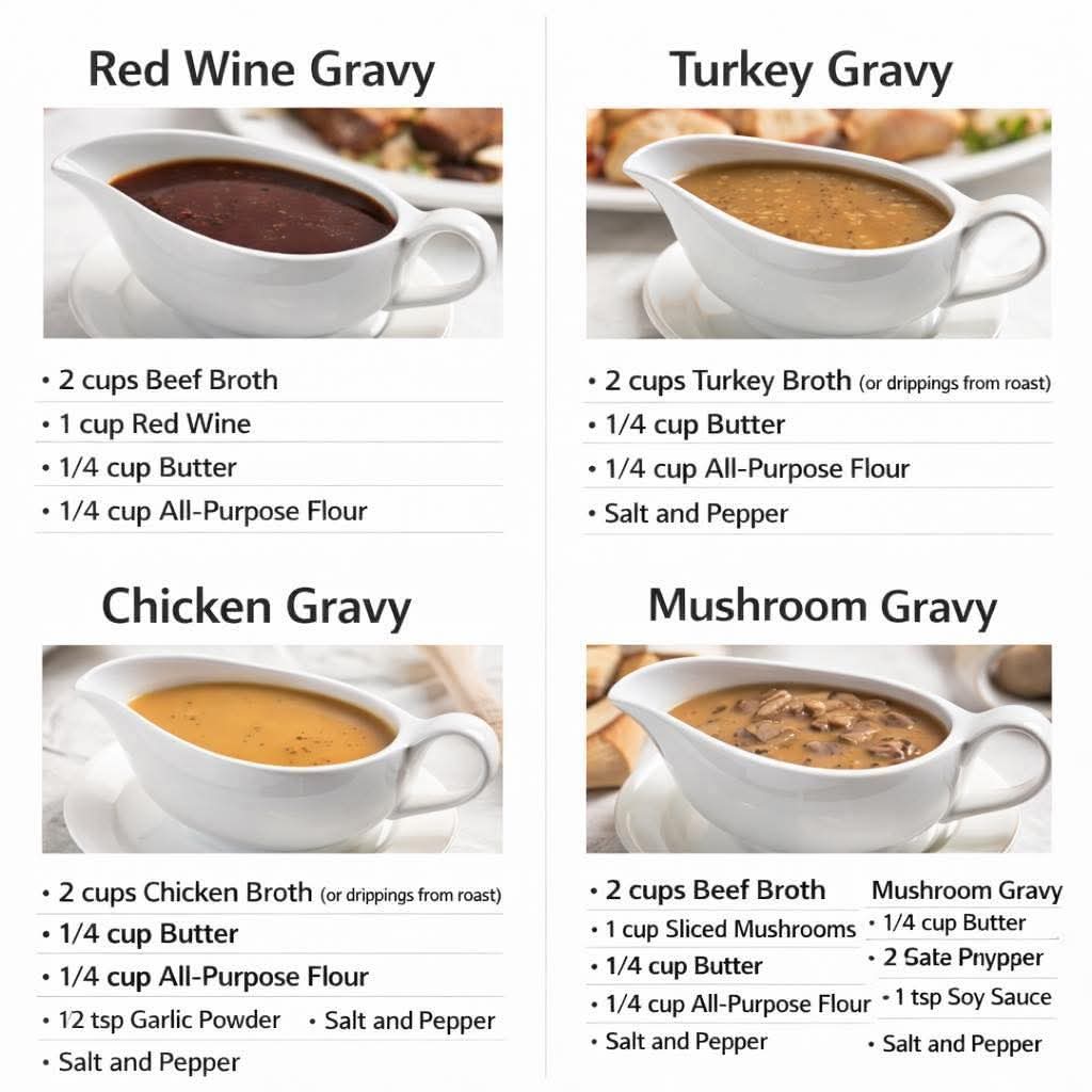 These four gravies cover every classic pairing—from beef and turkey to chicken and vegetables. Simple ingredients, proper technique, and thoughtful seasoning create sauces that elevate any meal.