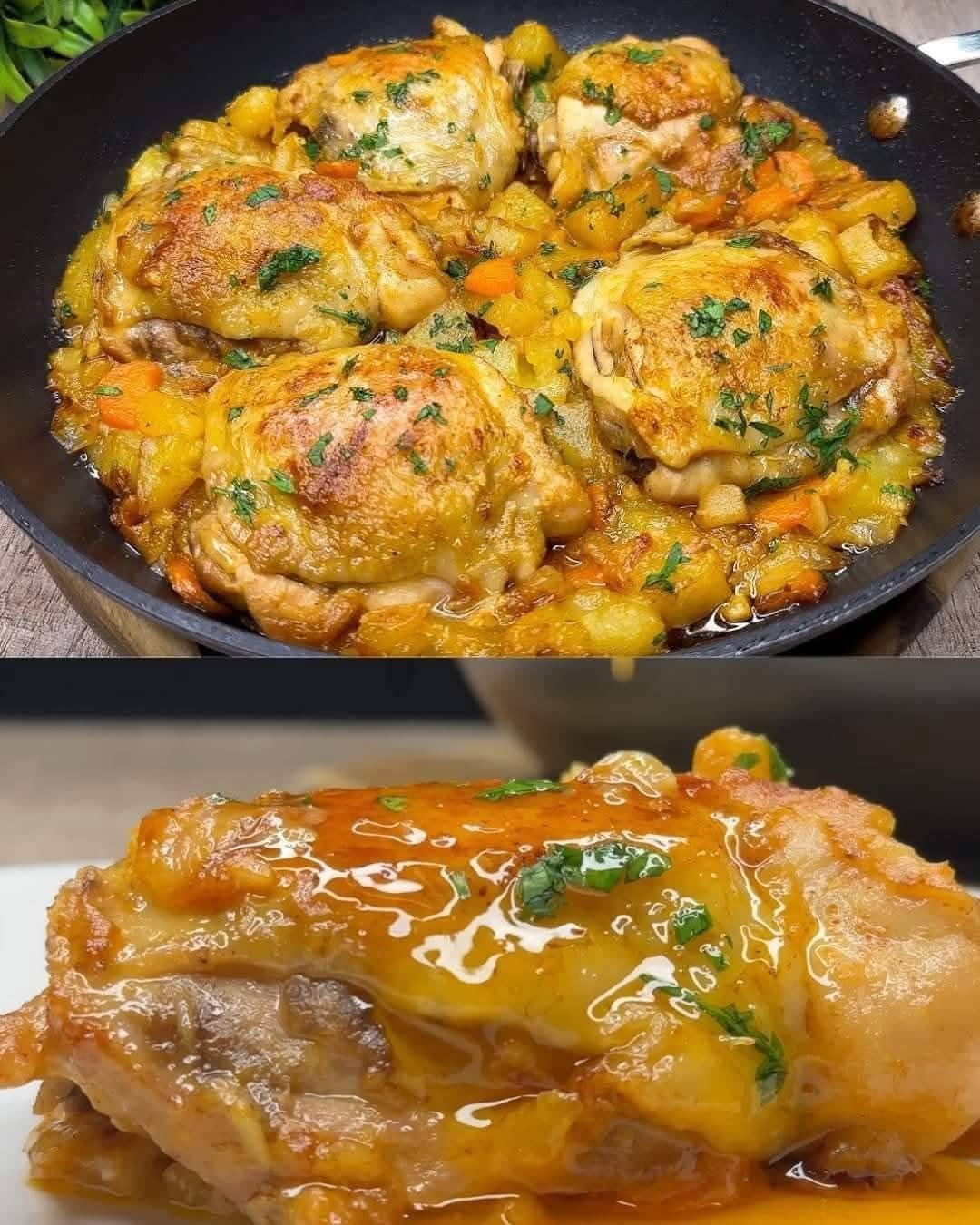 - In a skillet, heat some olive oil over medium-high heat. Add the chicken thighs and cook until golden brown on both sides. Remove the chicken from the skillet and set aside.