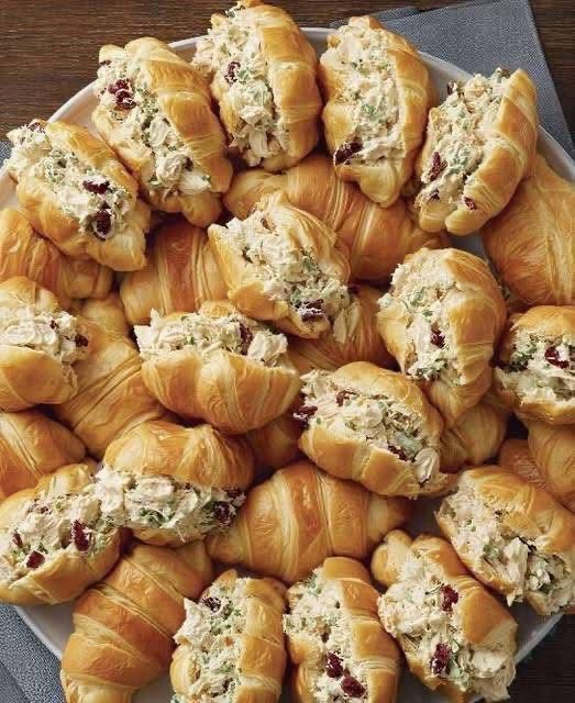 - Slice the mini croissants in half and spoon a generous amount of chicken salad inside each one.