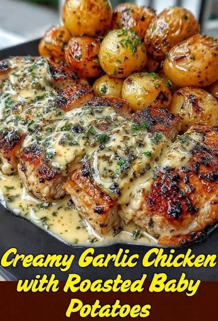 Serve the creamy garlic chicken with the roasted baby potatoes on the side.