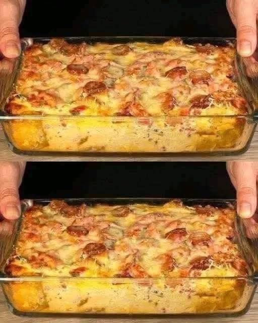 Start with half of the remaining lasagna noodles, then add half of the remaining chicken, half of the remaining ham, and one more cup of cheese sauce.