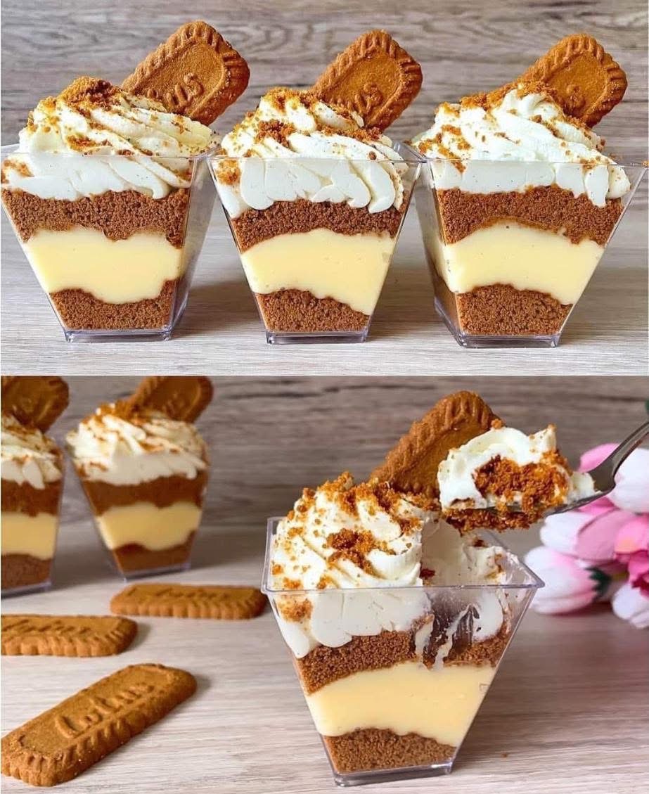 Delicious Layers: The combination of Biscoff biscuits, custard, and whipped cream is simply irresistible.