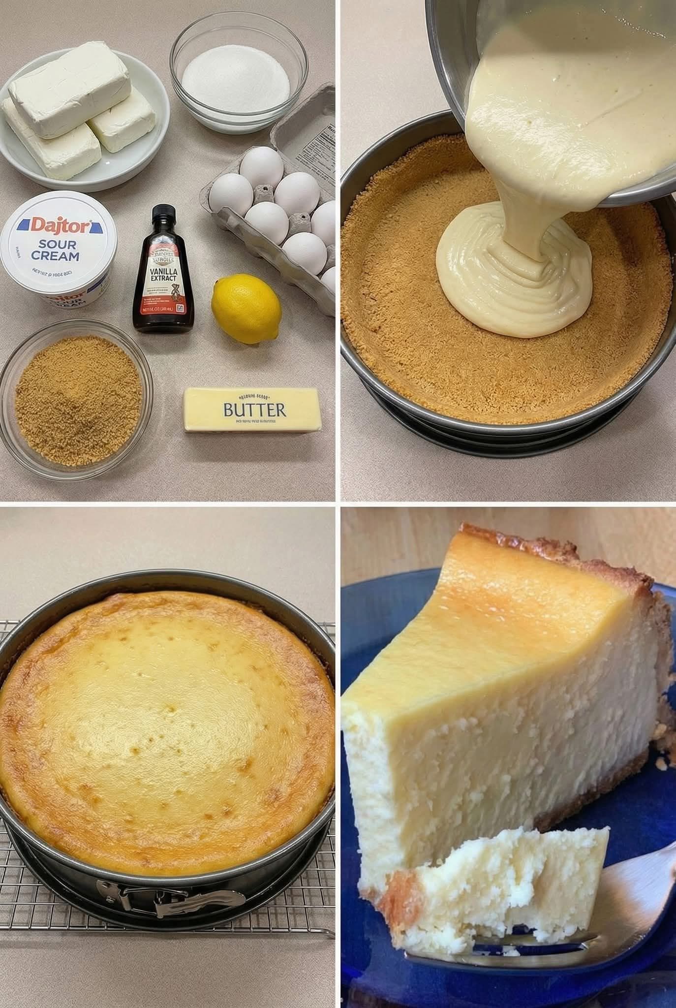 It looks like your recipe got cut off after the eggs. For a classic New York Cheesecake, youโll usually still need a few more ingredients for the filling (commonly sour cream, vanilla, and sometimes flour or lemon juice), plus the baking instructions.